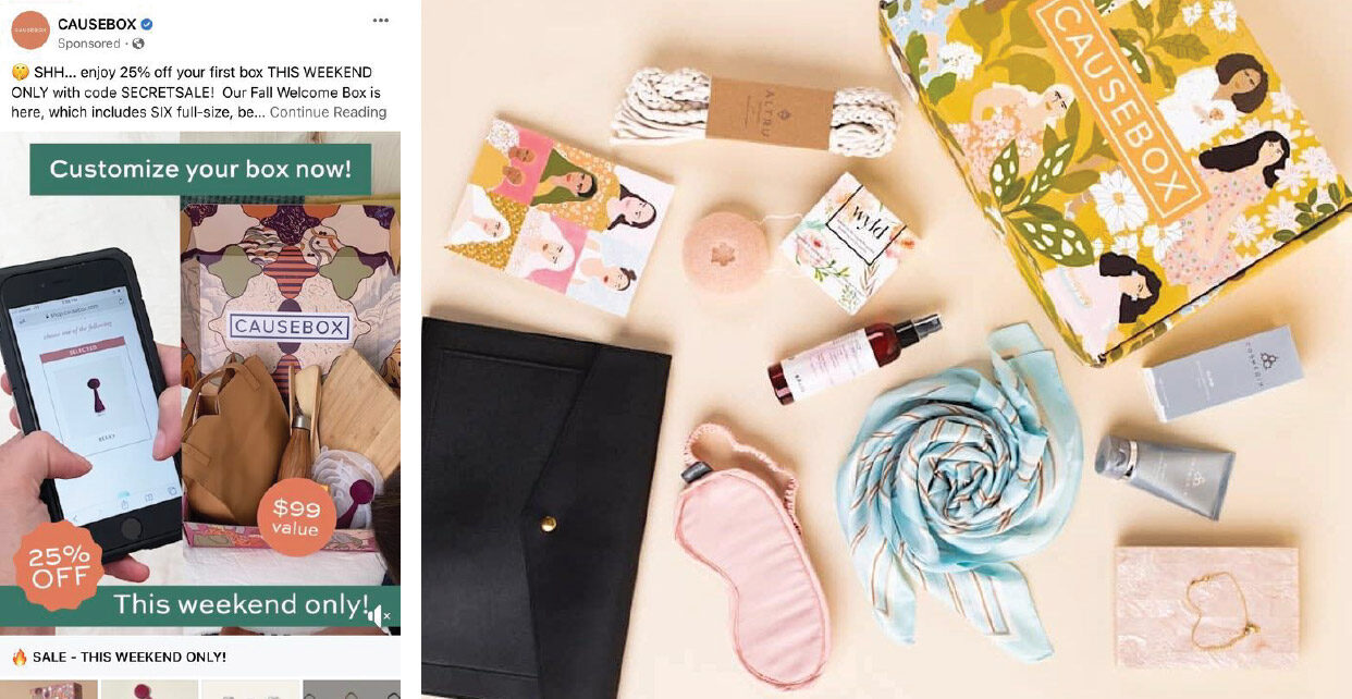 2020 has been a year of subscription boxes. CAUSEBOX, a beauty subscription box service, released their Fall Welcome Box with a goal to bring in new leads. They are committed to supporting small scale makers and protecting the planet, right on point for this holiday season! Their Facebook ads were visually appealing and included numbers within the graphics to grab the attention of consumers. On top of its rad design, the ad provides all the information you need to know about the brand in 10 seconds.